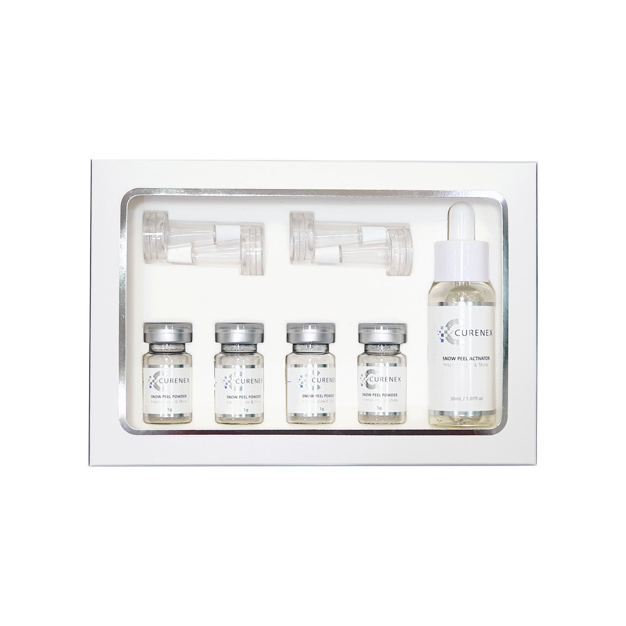 A box of CURENEX SNOW PEEL is composed of 4 x 1g vials of Snowpeel powder and 30ml of Snowpeel Activator.
